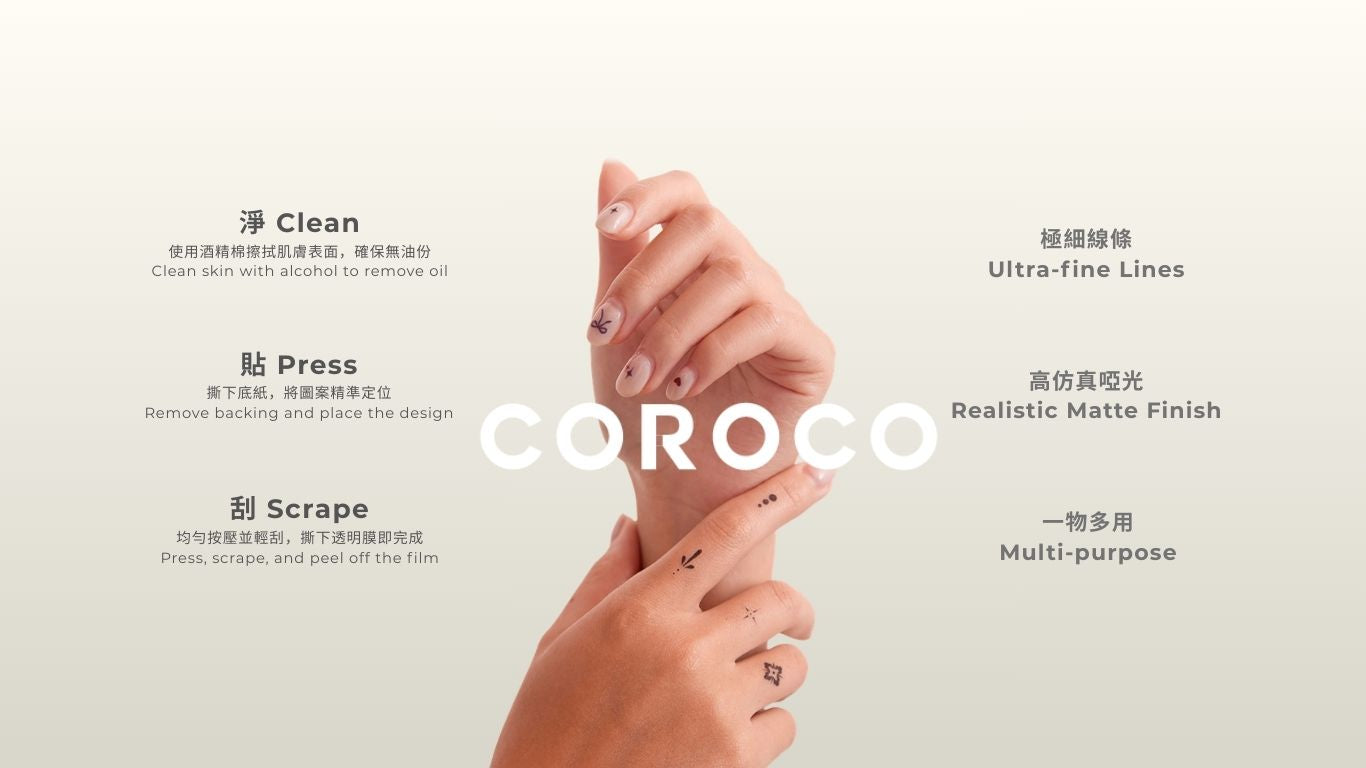 COROCO is a creative brand founded by Coco, a Hong Kong-based tattoo artist. The brand was born from her observation of how tattoos serve as a profound medium for people to etch their beliefs, memories, and courage. In her daily life, she also noticed many who admire body art but hesitate—perhaps due to the weight of a lifelong commitment, professional constraints, or simply not having found that one deeply meaningful design yet.The heart of COROCO is to break the boundaries of traditional tattooing. It aims to integrate this ancient body art into everyone’s life in a lighter, freer way.